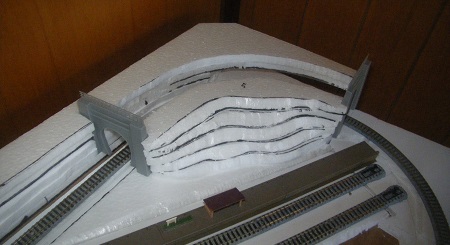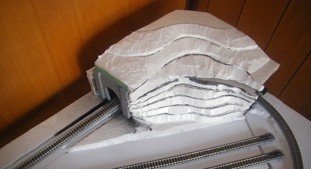 前回は、トンネルの側壁までの高さまで作成し接着しました。接着が硬化したようなので、引き続きトンネル天版より上方の山を整形して参ります。