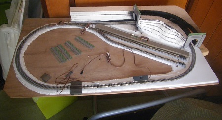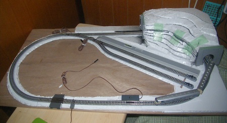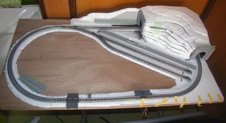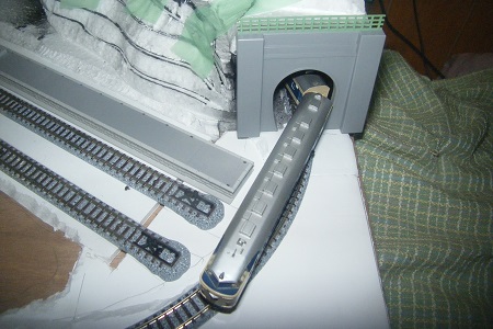 取りあえず、山頂部分を養生テープで仮止めして、トンネルポタールの位置決めです。この状態で、車両を走行させてみて、車両と各構造物が接触しないかを慎重に確認します。写真は、大型な車両として583系を試運転して確認している状況です。