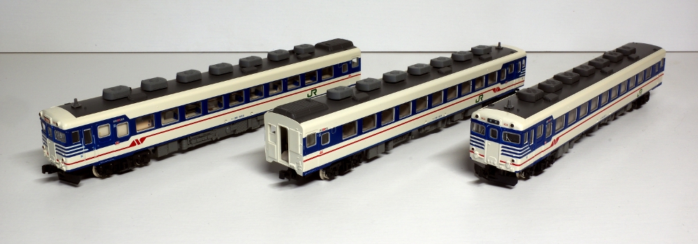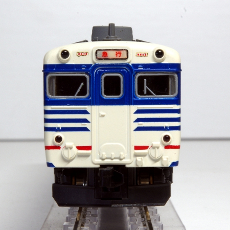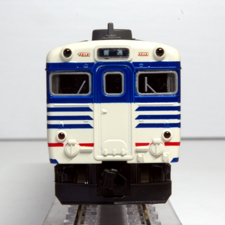 模型は、この新潟色のキハ58系を再現した物で、複雑なラインの塗装も良く再現されていおり、運転席側には単線形スノープローが装着されています。また、増解結の自由な気動車ですので、各先頭車の前尾灯は消灯スイッチが装備されています。3両編成ですので、省スペースのレイアウトにも丁度良い製品です。