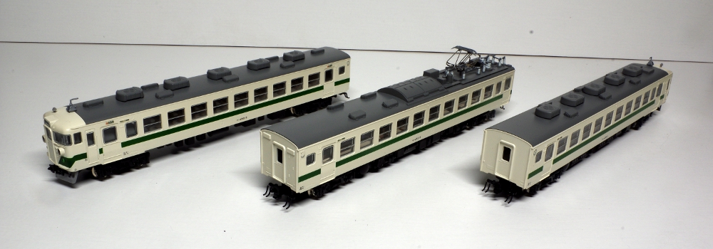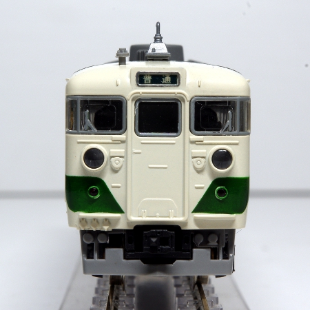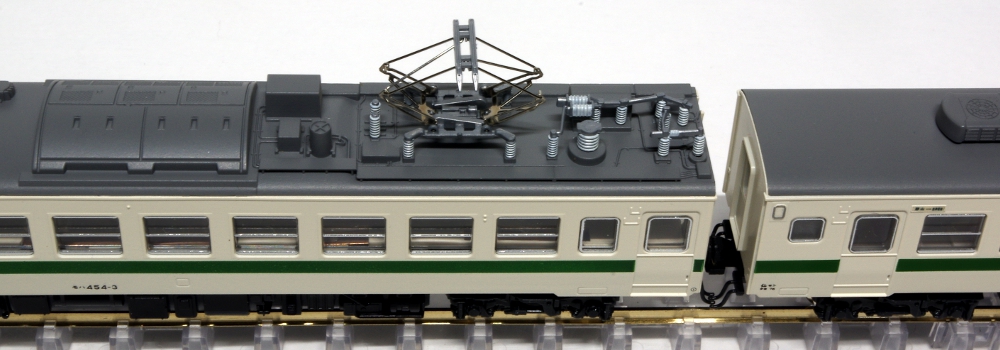 模型化された最終製造形の165系は、製造時から冷房が搭載されており、屋根上のベンチレーターの配置が異なっている事が特徴です。また、中間電動車のモハ164ー8000番台は中央本線高尾以降の狭小トンネルを通過可能な低屋根構造のパンタグラフを搭載した車両で、非冷房の車両は低屋根部分に換気用のルーバーが設置されていましたが、新製冷房車は当初からルーバーがありませんでした。この様な最終製造グループの特徴を的確に再現したモデルとなってます。