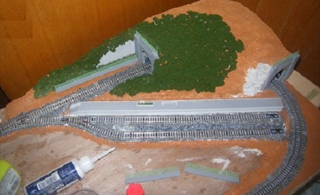 山間部を植栽している状況です。とにかく接着が効きません。ちょこちょこと様子を見て試行錯誤しながら、植え込んでいる状態です。