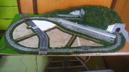 前回は、レール周りのバラスト撒き作業でしたが、バラストの固着も完了しました。