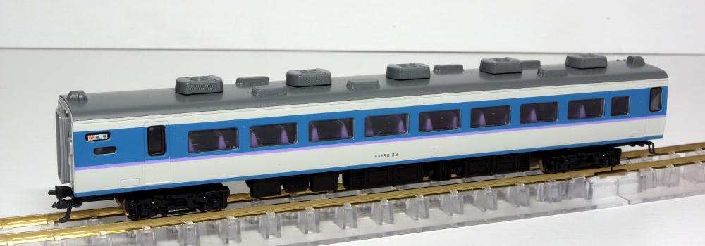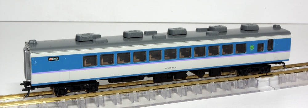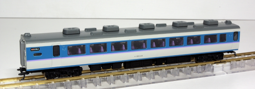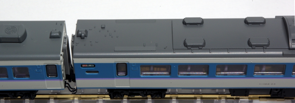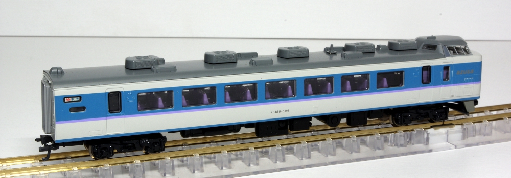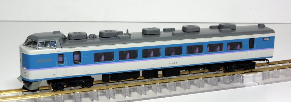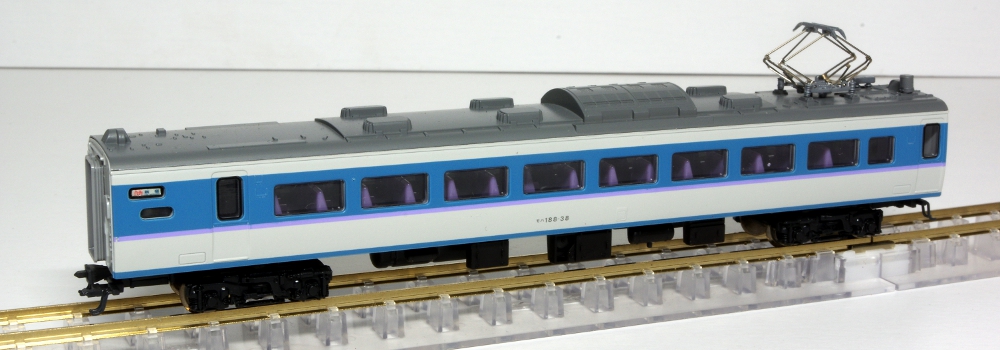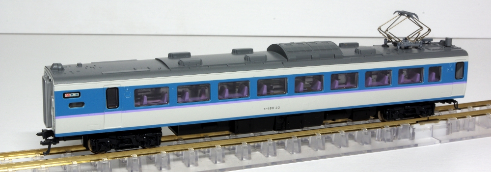 モデルのほうは、実車同様の「あずさ色」を再現しており、グレードアップ車の特徴の指定席車両の大窓・指定席車の従来の小窓も実車どおりに再現されており、中間車のモハ188は1993年頃より開始された第2パンタグラフ撤去後された姿が的確に再現されています。
