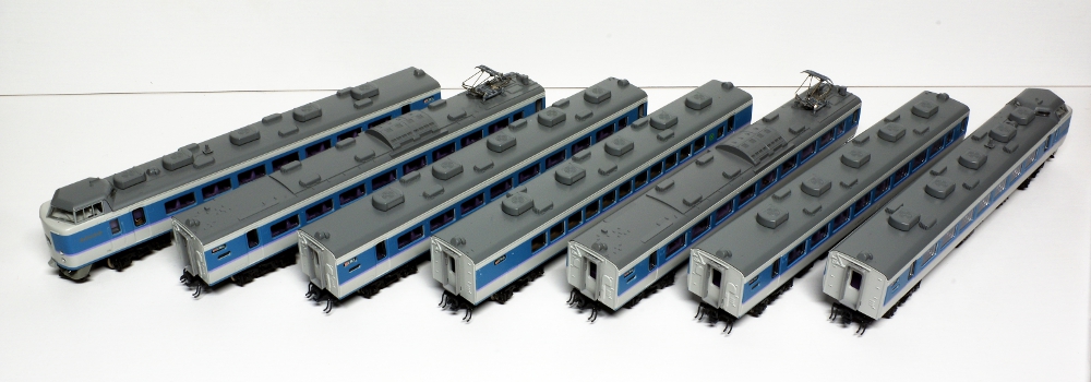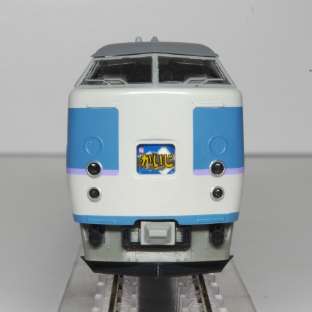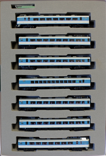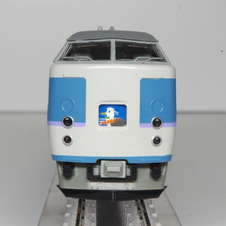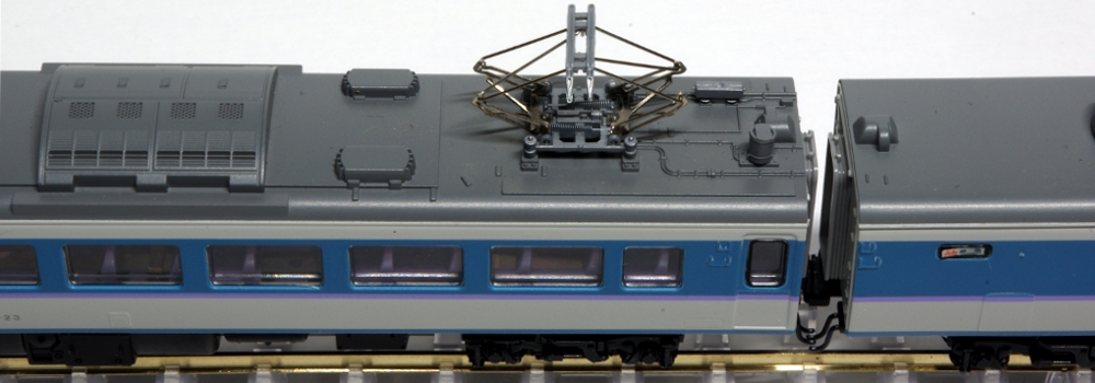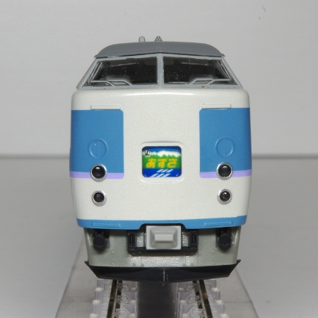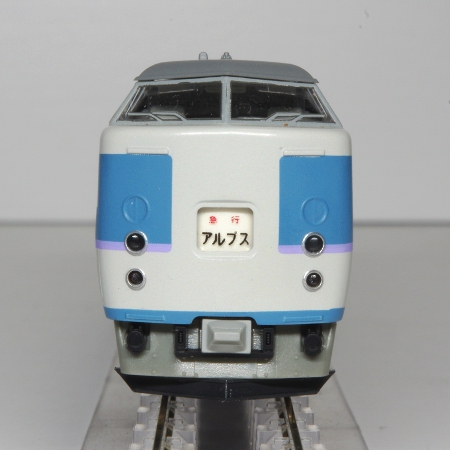 模型は、中央本線の特急「あずさ」・「かいじ」に転用された後の仕様で、塗装も中央特急用のフォーギグレーをベースにアルパインブルー・ファンタジーバイオレットの帯を配した「あずさ色」に変更された姿です。