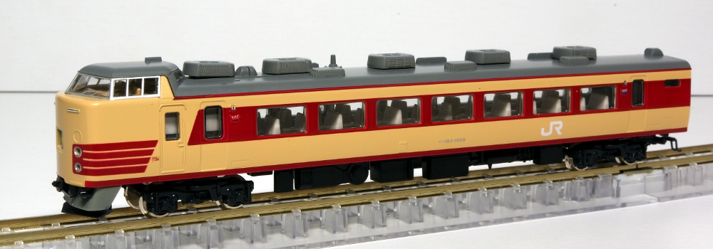 実車の特急マークが戻されなかった編成を始めて見たときは、折角の特急色なのに、何とも間抜けに感じたものです。模型に関しては、鉄道模型を再開した当時、183系の特急色編成をKATOが長らく再生産していなかった様で、仕方なく買ったのですが、よく見てみると赤帯の太さなど面白い製品ですね。