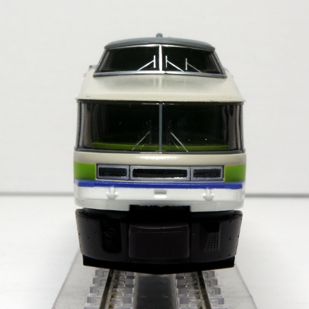 実車は、小学生頃に大宮駅で偶然目にする機会があり、「パノラマエクスプレスアルプス」とはまた違った落ち着いた爽やかな塗装で好きになった車両です。模型の方も、実車の塗装が良く再現されており良い雰囲気ですが、先頭車のライトユニットが少々大きくて、折角のパノラマ展望部の座席表現が無く窓下からちょっとだけはみ出しているのが残念です。