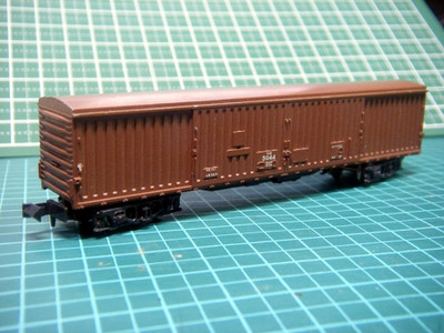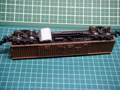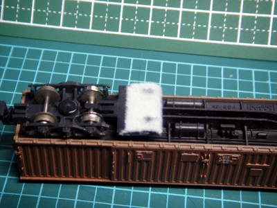 (下図に示す)今回は、編成の中に混ぜても気にならないだろうと思い、こちらのKATOの貨車ワキ5000を使用してみることにしました。こちらの車両は、かれこれ20年以上前の商品で、床下の商品番号がNo.804と打たれている旧番号区分の商品です。自分が多分最初に買ってもらった貨車だと思います。