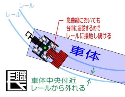 当然、バネの力でパッドをレールに押しつけようと考えると、車重さが大きい方が設置圧が高く成るのでは?と当初から考えていたこともあり、大型のボギー貨車をクリーニングカーの母体として、始めに考えていたのですが、ボギー台車の車両では次の図に示す様な問題があり、パッドの拭き取り圧の強化の検討については、暫く保留としていました。