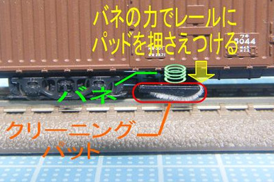 そこで、下図のようにクリーニングパットと車両本体の間に、バネをはさみ、パットがレールに押しつけられるように出来ないかと考えました。