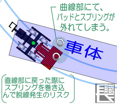 曲線部にてパットがスプリングから外れてしまい、直線区間に戻る際に、今までパットを押していたスプリングが、枕木の方へ垂れているものだから、スプリングを車体外に押し出す方向へパッドが割り込んでしまい、恐らくここで脱線を生ずると思う。
