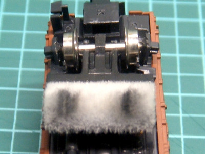 ただし、自分が所持している2軸有蓋貨車は、TOMIX製のワム380000形なんですよね。この車両、車軸に集電板用の押さえが付いており、クリーニングパット(KATO 001HC001)を挟み込む事が出来ないのです。