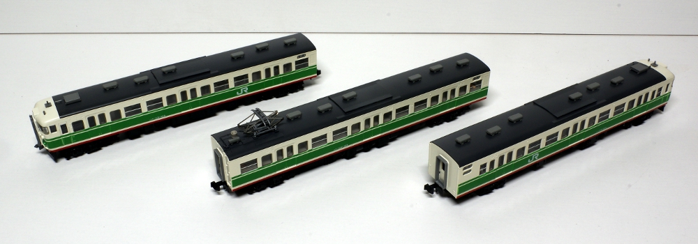 模型は国鉄民営化後の’89年に長野地区に登場した信州色(旧長野色)と呼ばれる、「長野県のイメージにふさわしい爽やかなエコー電車」をコンセプトにした、アイボリーホワイトをベースに、さわやかな山の緑色の帯と、紅葉をイメージした赤色の帯を配したカラーリングの車両をモデルとしています。